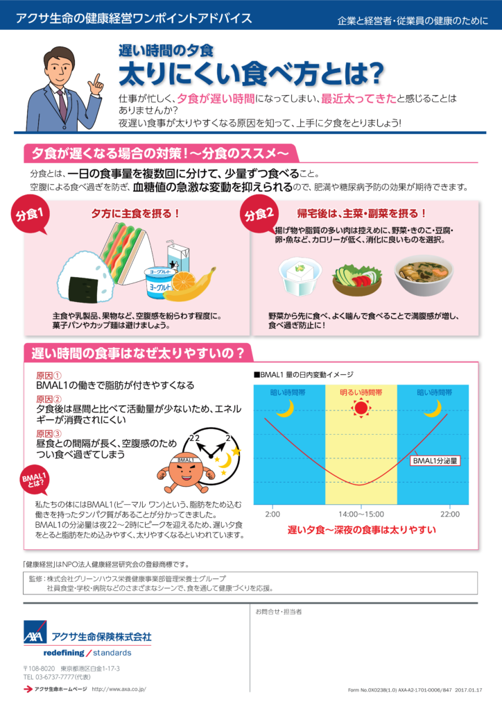 健康経営 健康ワンポイントアドバイス㊿ Posted 2025年11月10日2025年11月10日 onix 遅い時間の夕食~太りにくい食べ方とは? 仕事が忙しく、夕食が遅い時間になってしまい、最近太ってきたと感じることはありませんか? 夜遅い食事が太りやすくなる原因を知って、上手に夕食をとりましょう! 太りにくい食べ方とは?(PDF)