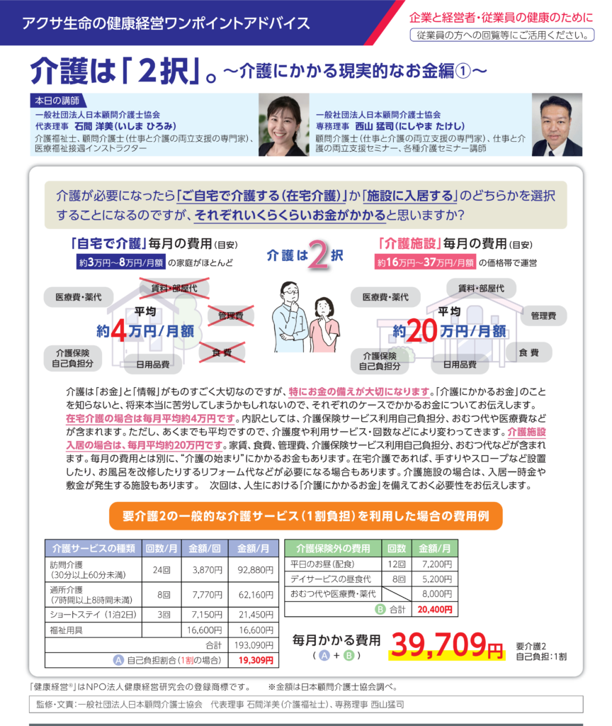 健康経営 健康ワンポイントアドバイス55 Posted 2026年2月3日 onix 介護は「2択」。~介護にかかる現実的なお金編①~ 介護が必要になったら「ご自宅で介護する(在宅介護)」か「施設に入居する」のどちらかを選択 することになるのですが、それぞれいくらくらいお金がかかると思いますか? 介護にかかる現実的なお金編➀(PDF)