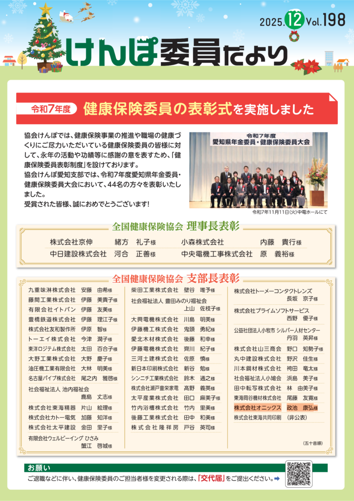 このたび、当社専務が全国健康保険協会愛知支部様より、健康保険委員として表彰を受けました。
